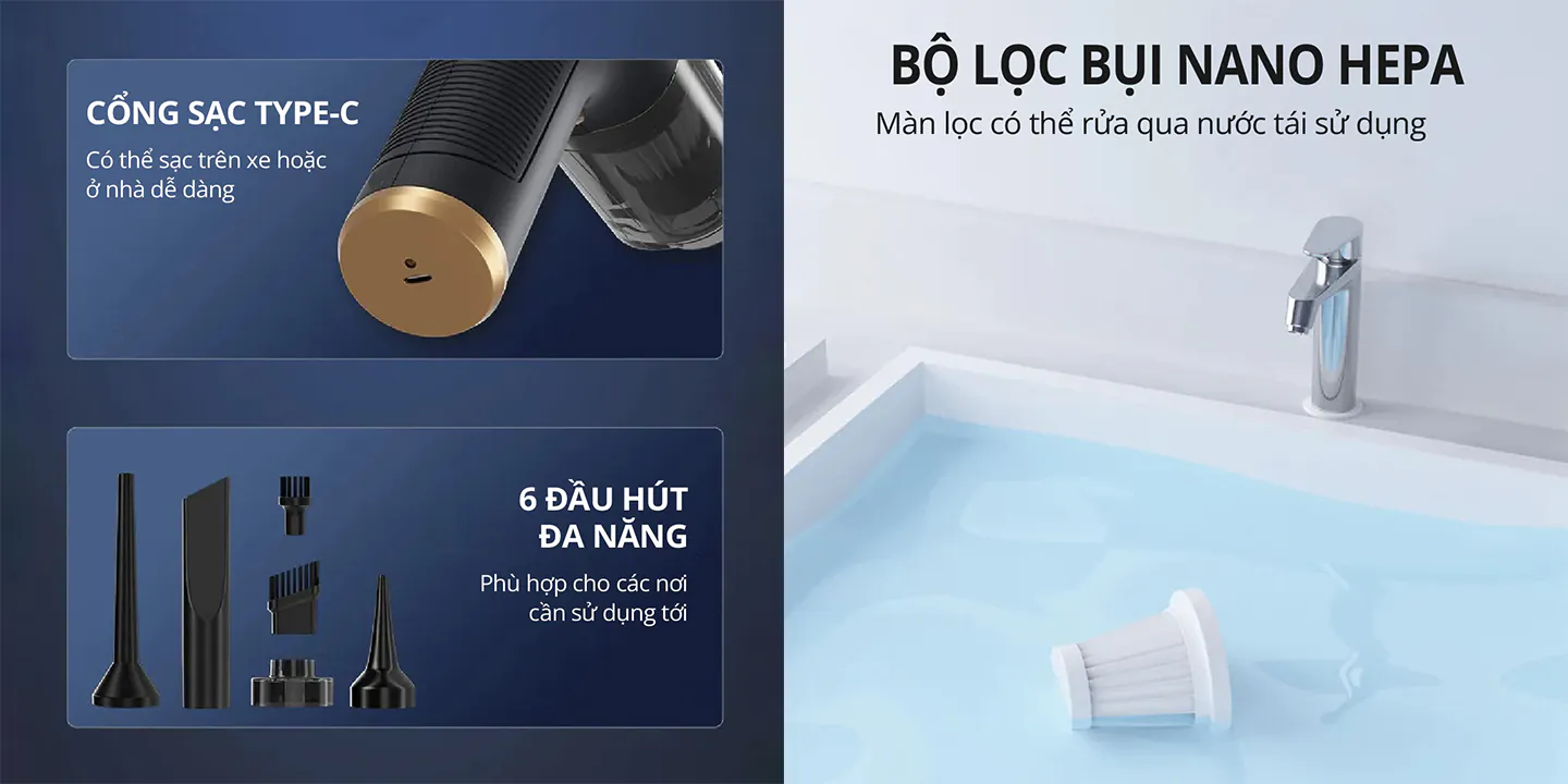 Ngoài ra, với tính năng hút bụi mini và bộ lọc bụi Nano Hepa, sản phẩm không chỉ giúp bạn làm sạch hiệu quả mà còn bảo vệ sức khỏe của gia đình. Bộ lọc này có thể tái sử dụng sau khi rửa qua nước, giúp tiết kiệm chi phí và bảo vệ môi trường. Đây là một điểm cộng lớn mà mình rất thích!